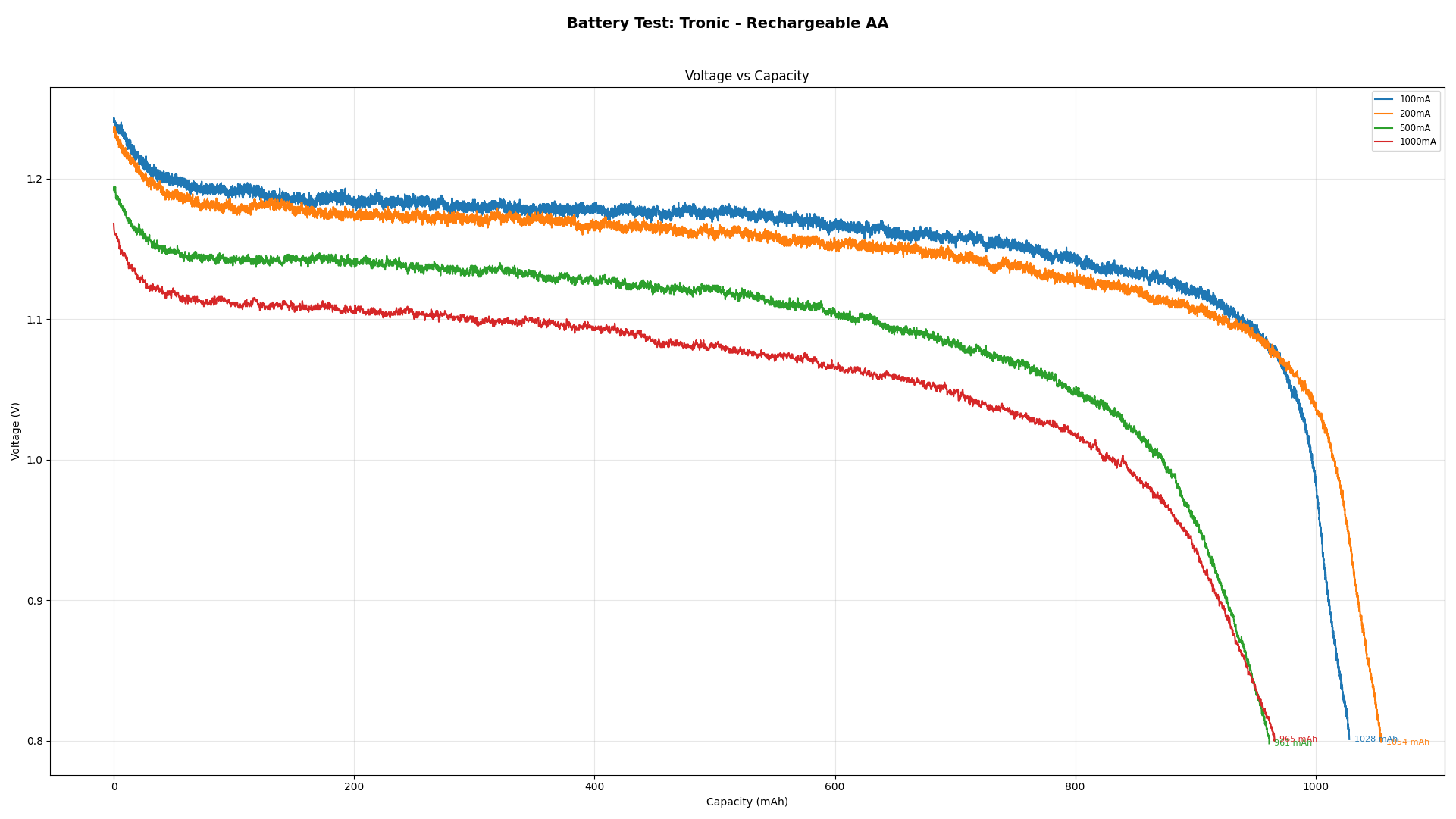 06 Jan 2026 Battery Tests Tronic - Rechargeable AA (2023) Brand 100mA 200mA 500mA 1000mA Tronic - Rechargeable AA 1028 1054 961 965